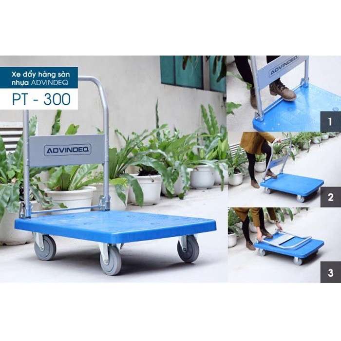 ƯU ĐIỂM NỔI BẬT CỦA XE ĐẨY HÀNG 4 BÁNH SÀN NHỰA ADVINDEQ PT-300Xe đẩy hàng 4 bánh sàn nhựa ADVINDEQ PT-300 chính hãng mang đầy đủ các đặc tính nổi trội thương hiệu Advindeq Đài Loan. Kích cỡ nhỏ nhắn chỉ 12kg nhưng khả năng chịu tải lên tới 300 ~ 320 kg, thiết kế chắc chắn từ thép cao cấp, an toàn và tính cơ động rất cao, hơn nữa còn có thể gấp gọn nhằm tiết kiệm không gian lưu trữ. Xe đẩy hàng sàn nhựa PT-300 là một sự lựa chọn hoàn hảo cho các văn phòng, cửa hàng, nhà kho,…