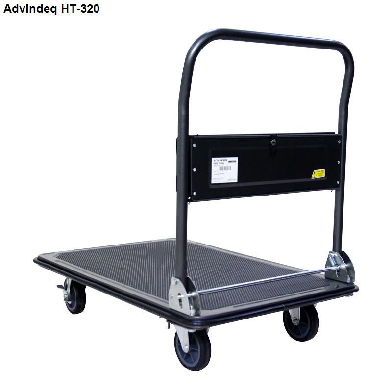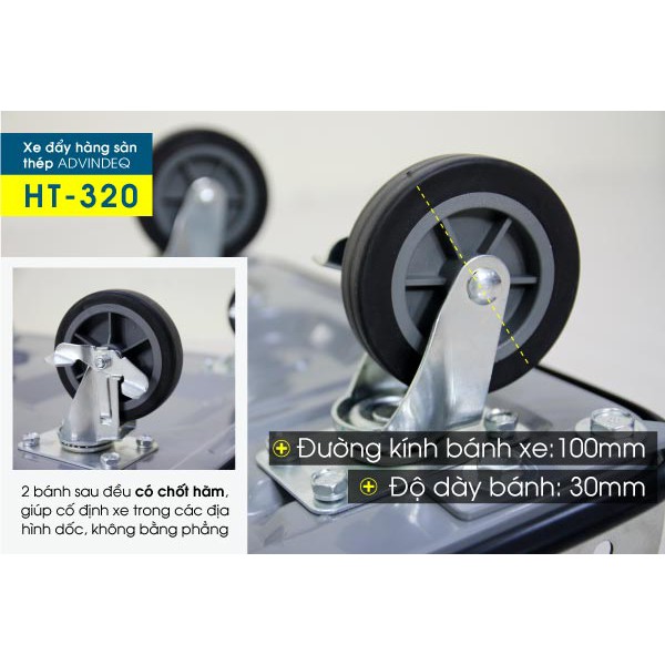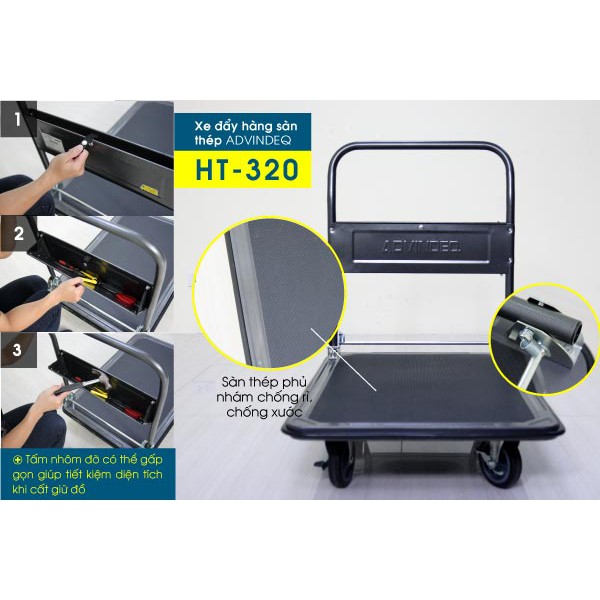 Xe đẩy hàng 4 bánh sàn thép phủ nhám ADVINDEQ HT-320, tải trọng lên tới 320kgTiếp nối thành công của dòng xe đẩy hàng 4 bánh gấp gọn nhập khẩu TL-150, TL-300, Advindeq đã cho ra mắt các dòng xe 4 bánh mới với màu sắc, chất liệu, tính năng và tải trọng mới, 1 trong số đó là dòng xe kéo đẩy hàng HT-320 được ra mắt với chất liệu thép sơn tĩnh điện màu ghi xám, phủ hammertonne nhám chống rỉ, chống xước.