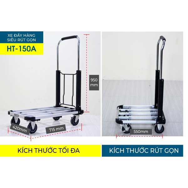 Xe đẩy hàng 4 bánh siêu rút gọn điều chỉnh sàn Advindeq HT-150A (tải trọng 150kg, sàn xe rút siêu gọn,bánh có chốt hãm)