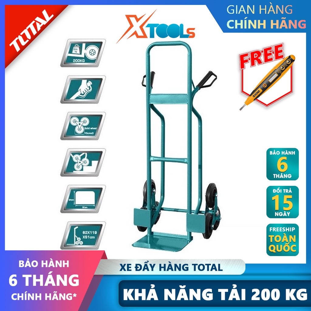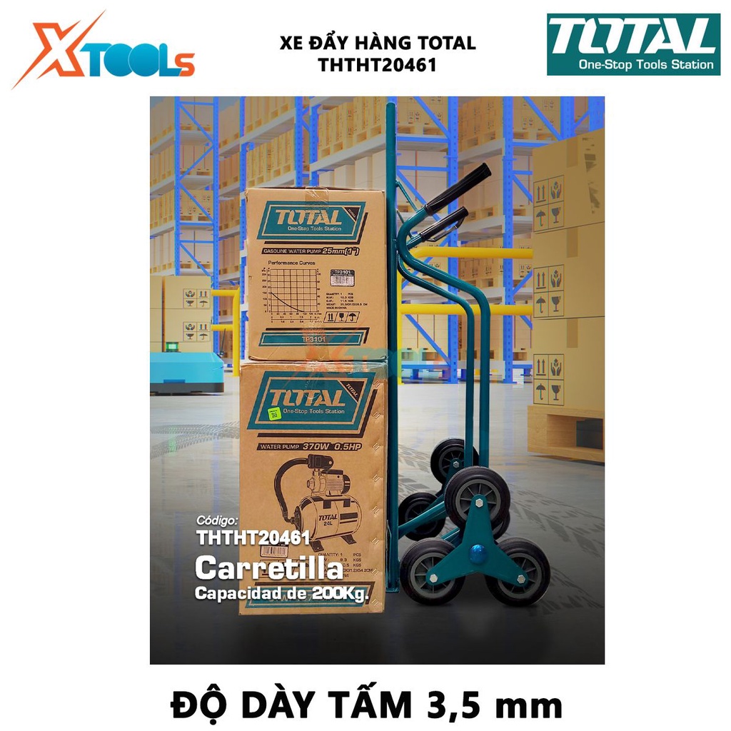 - Xe đẩy hàng bằng tay Total THTHT20461 có chức năng chính dùng để vận chuyển các vật nặng một cách dễ dàng hơn. Bộ khung thép này có độ chắc chắn, bên ngoài còn được sơn một lớp chống rỉ giúp nâng cao độ bền của xe. Khi không sử dụng, xe đẩy này không chiếm nhiều diện tích để cất giữ và dễ dàng sửa chữa khi có hỏng hóc nên được người dùng rất ưa chuộng.