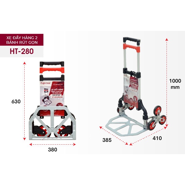 - Xe kéo đẩy hàng 2 bánh mini rút gọn FUJIHOME HT-280 hỗ trợ cho việc vận chuyển các loại hàng hóa nặng (lên tới 80kg). Phù hợp sử dụng trong các nhà kho, siêu thị, nhà máy, sân bay,…