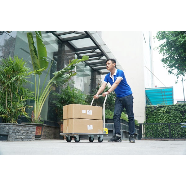 - Khi cần đẩy hàng, sắp xếp hàng hoá gọn gàng trong mặt sàn xe. Dùng chân đẩy nhẹ phần đuôi xe đồng thời kéo tay cầm nghiêng về đằng sau. Lúc này, bạn đã có thể thoải mái đẩy hàng tới nơi cần thiết mà không mất quá nhiều sức lực.