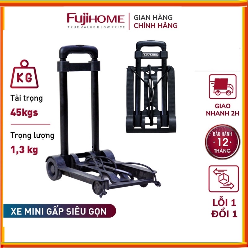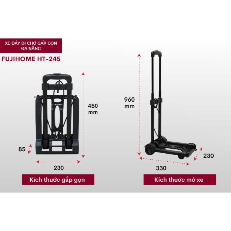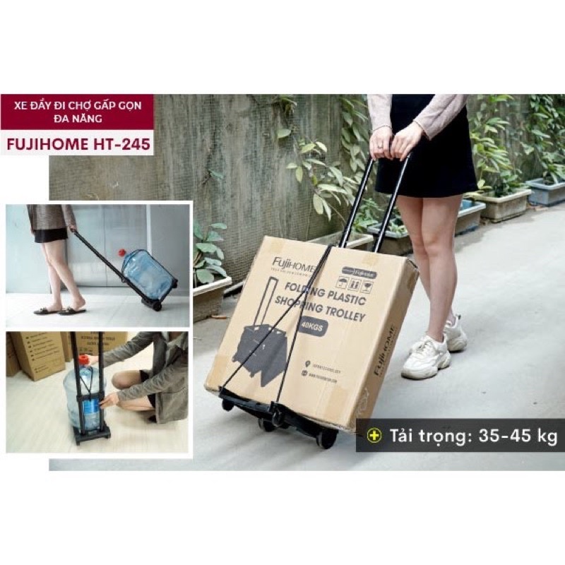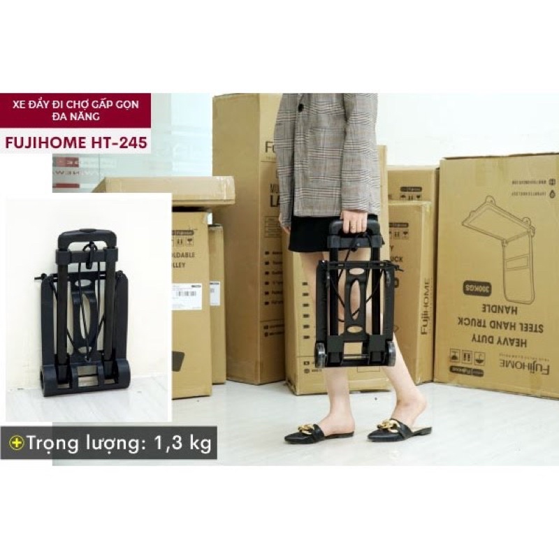 - Xe đẩy mini đi chợ siêu thị gấp gọn đa năng FUJIHOME HT-245: sử dụng đẩy chở hàng-xếp gọn nhẹ xách tay hoặc cho vào oto- xe máy rất tiện lợi với trọng lượng chỉ 1.3 kg nhưng xe chở tới <40kg