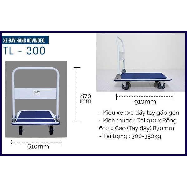 Nhà cửa & Đời sống > Dụng cụ & Thiết bị tiện ích > Xe đẩy || Xe đẩy hàng 4 bánh gấp gọn chở 300kg sàn sắt thép ADVINDEQ TL-300, bánh xe có chốt hãm - Bảo hành 1 nămCòn hàng