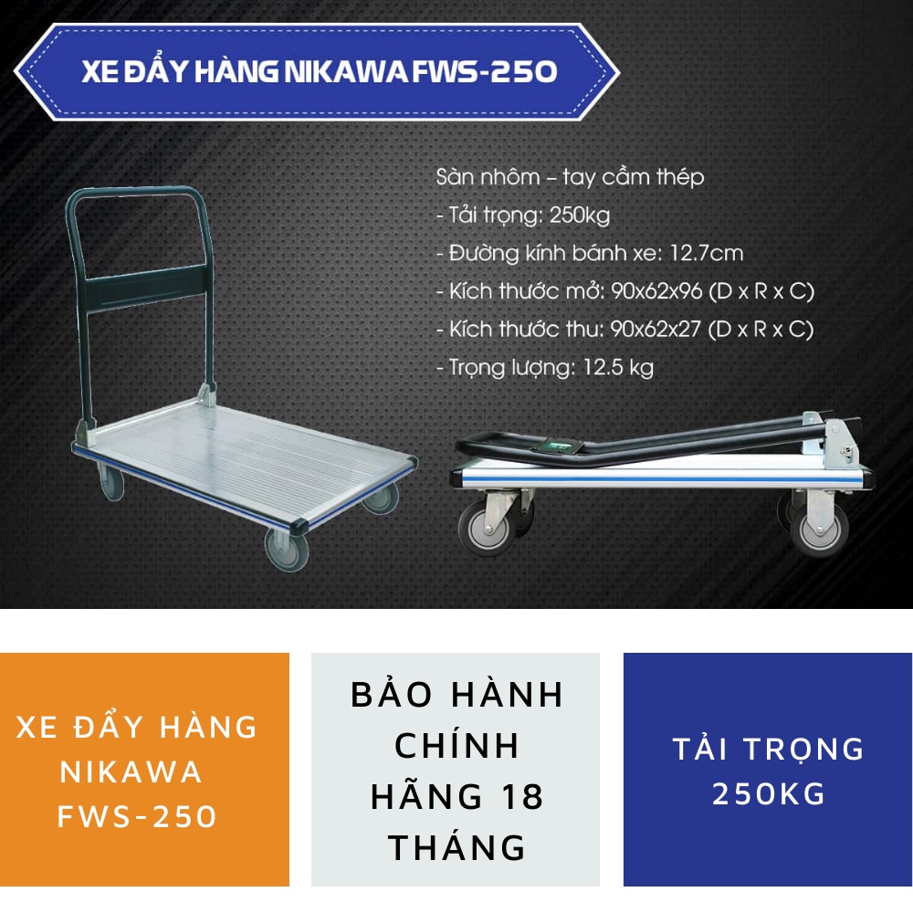 1. Thông tin sản phẩm Xe đẩy hàng, xe kéo hàng Nikawa FWS-250, 4 bánh, sàn nhôm, tay cầm thép, tải trọng 250kgXe đẩy hàng Nikawa FWS-250 sản phẩm xe đẩy hàng của thương hiệu Nikawa nổi tiếng đến từ Nhật Bản. Nikawa FWS-250 được sản xuất bởi dây chuyền công nghệ cao cấp cho sản phẩm có chất lượng đặc biệt tốt và bèn bỉ theo thời gian.
