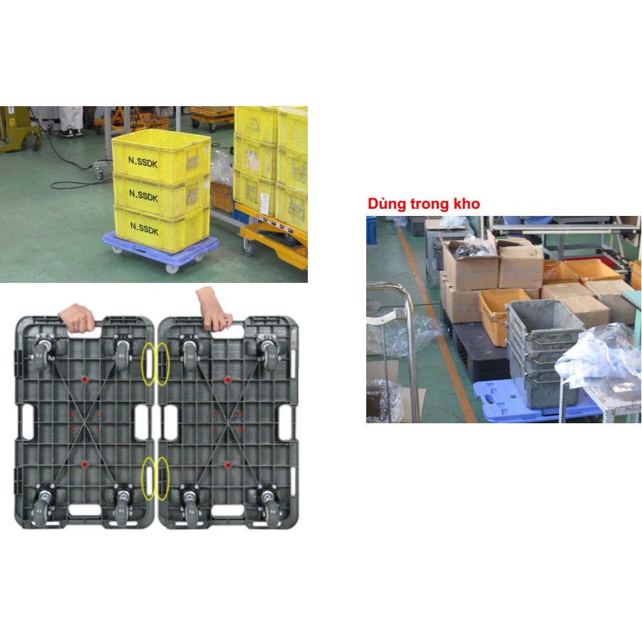 Sàn đẩy nhựa dùng trong các nhà xưởng, xí nghiệp giúp vận chuyển hàng hóa hoặc di chuyển hàng.