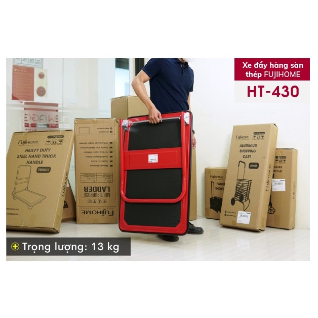 Xe đẩy hàng sàn thép 4 bánh Fujihome HT-430 - Tải trọng 300kgĐây là dòng xe 4 bánh mới ra mắt với màu sắc đỏ đen bắt mắt đặc trưng của thương hiệu FUJIHOME Nhật Bản, chất liệu thép và mức độ hoàn thiện cao cấp, tải trọng 300kg phổ biến và được sử dụng nhiều hiện nay.