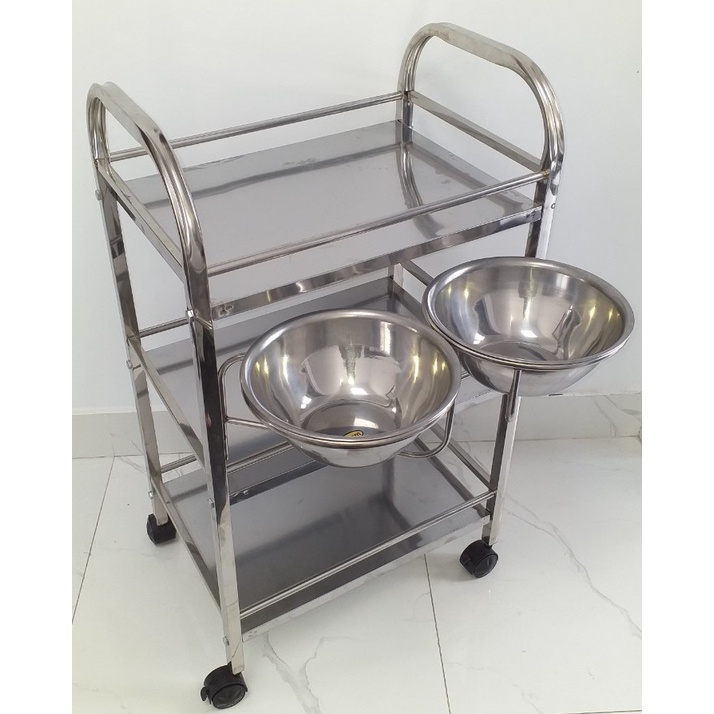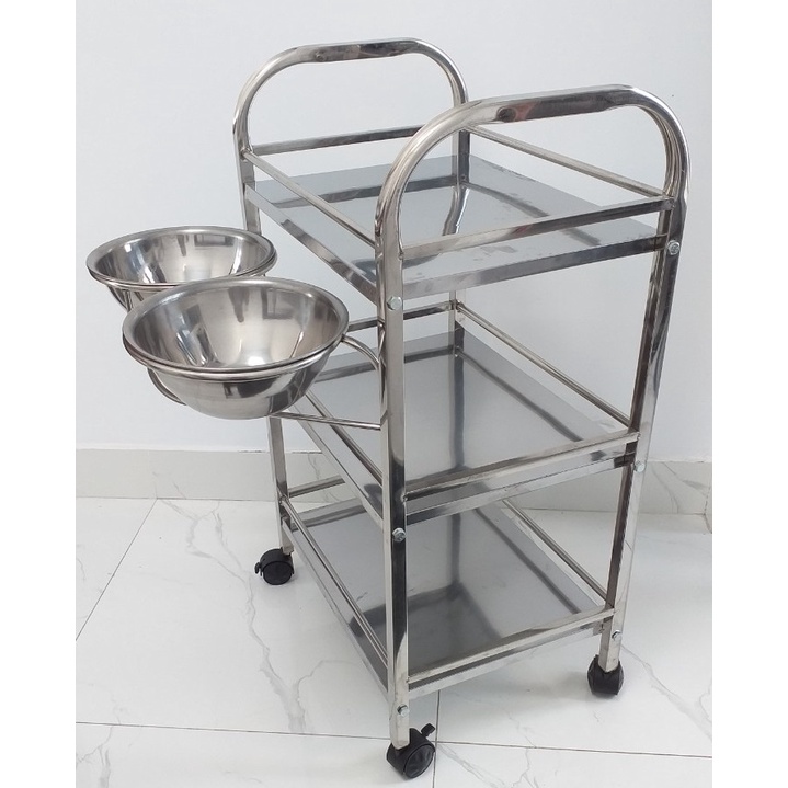 Xe đẩy spa inox kệ inox 3 tầng spa thẩm mỹ viện đựng dụng cụ tặng 2 thau inox