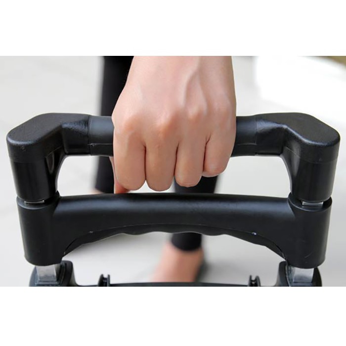 - Phần tay đẩy được làm bằng thép sơn tĩnh điện không gỉ, cứng và chắc chắn hơn nhôm, có lót miếng cao su giúp người sử dụng không bị đau tay khi phải dùng xe trong thời gian dài. Thép sơn tĩnh điện không bị oxy hóa theo thời gian, trọng lượng xe rất nhẹ chỉ 3.5kg, hai bánh xe thiết kế đường kính 5" chắc chắn, siêu cứng với khoảng cách 2 bánh rộng tác dụng chống lật.