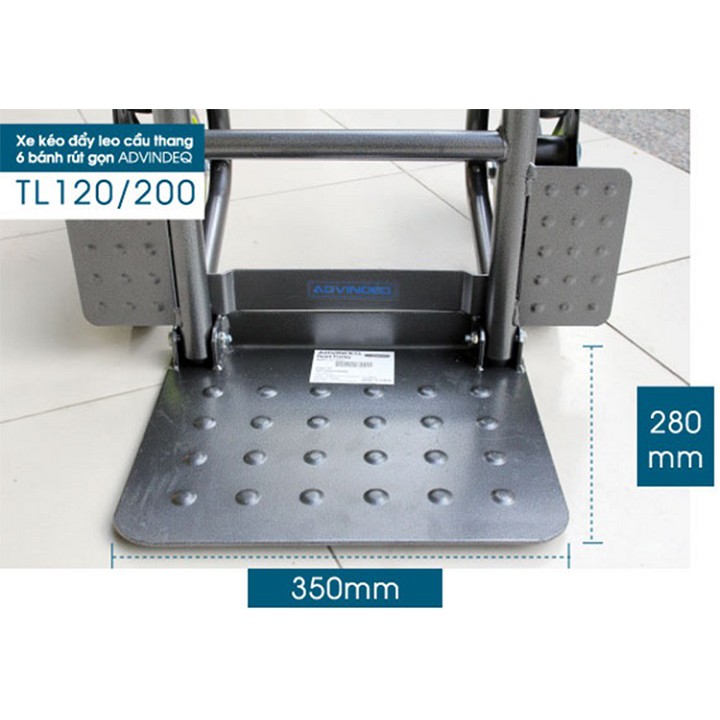 - Xe kéo đẩy hàng lên cầu thang ADVINDEQ TL-120/200 với tải trọng 120kg, khung xe được thiết kế từ thép ống, khung sơn tĩnh điện chắc chắn, giá đỡ bằng thép.
