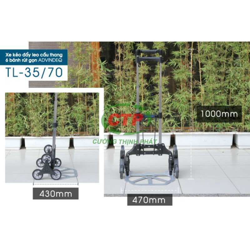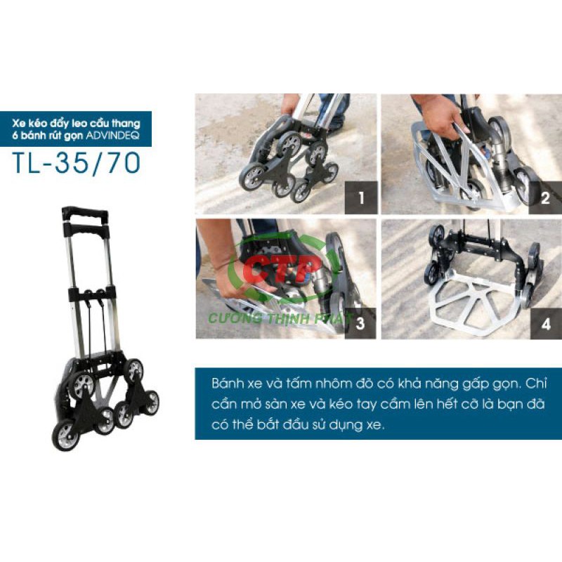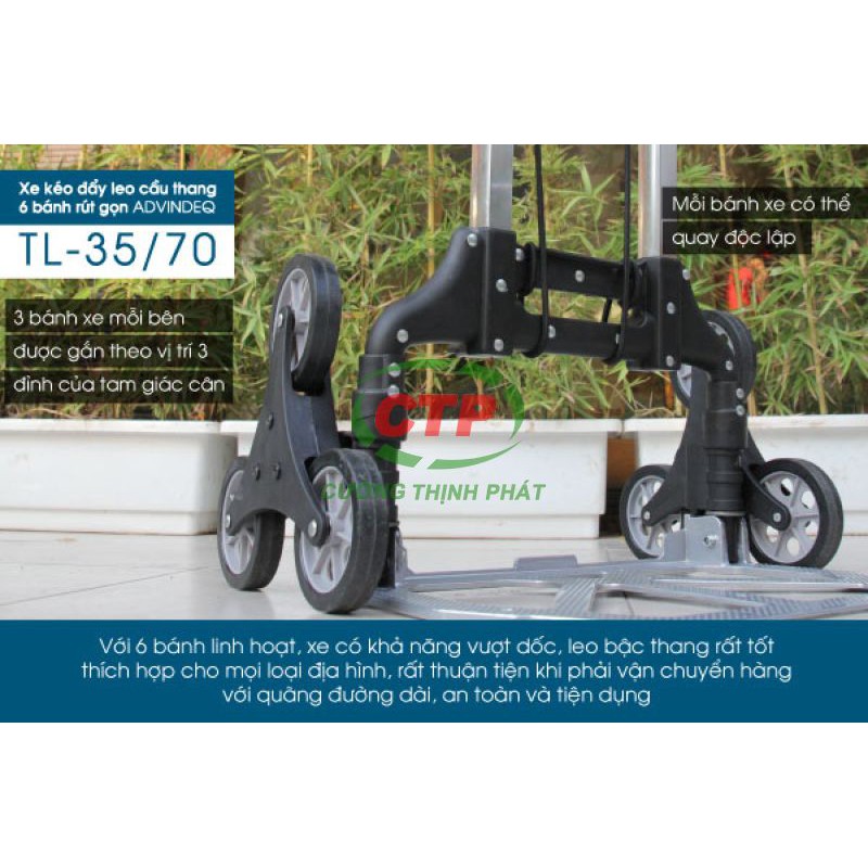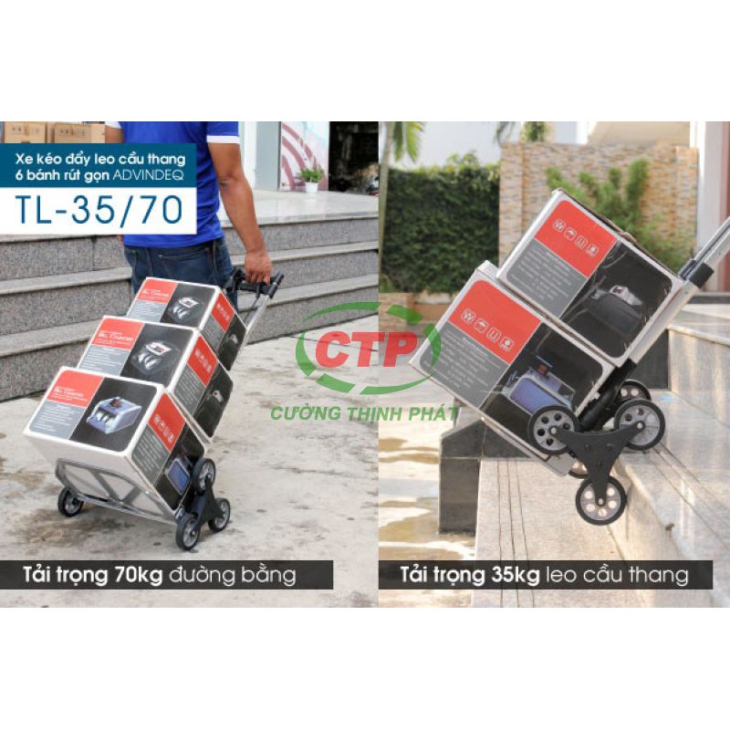 Xe Kéo Đẩy Leo Cầu Thang 6 bánh rút gọn ADVINDEQ TL-35/70 trọng tải leo cầu thang 35 kg, đường bằng 70kg được làm bằng hợp kim nhôm có độ bền cao, trọng lượng xe 3.5kg cực nhẹ so với các sản phẩm xe đẩy hàng sắt thông thường trên thị trường.Khung xe bằng khung nhôm định hình, giá đỡ hàng bằng gang đúc, giúp người lao động kéo hoặc đẩy hàng hóa dễ dàng hơn, an toàn hơn và năng suất hơn. Xe kéo hoặc đẩy hàng với khả năng di chuyển hàng hoá lên xuống cầu thang nhẹ nhàng tiện lợi, tải trọng khá lớn, đảm bảo đúng như công bố.