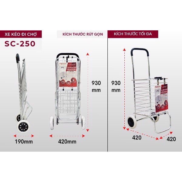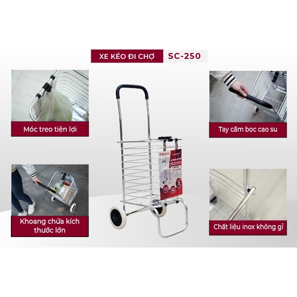 - xe kéo đi chợ siêu thị đa năng FUJIHOME SC-250 được làm từ chất liệu hợp kim cao cấp, sáng bóng, độ bền caom không gỉ sét