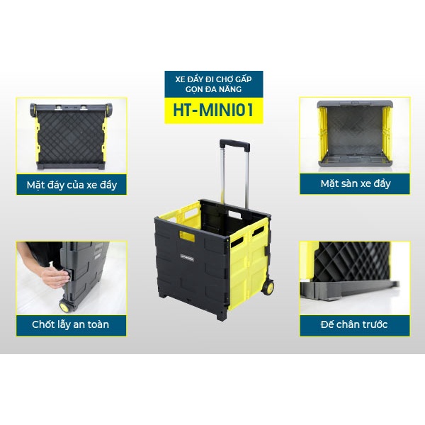 - Xe kéo đi chợ đa năng HT-SP02 được làm từ nhựa PP tổng hợp siêu bền với 2 màu vàng và đen. Giúp chúng ta có thể sử dụng để đi chợ , siêu thị, xếp gọn dùng trên ô tô,,,, chở nhiều mặt hàng khác nhau mà sản phẩm vẫn đảm bảo chất lượng.
