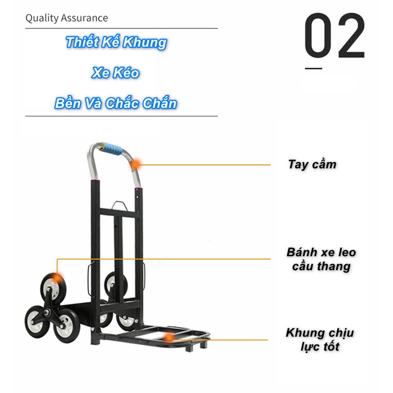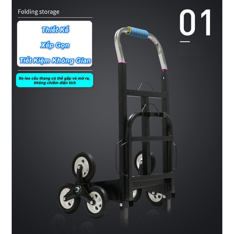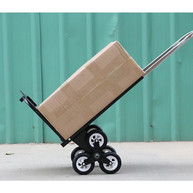 Xe kéo hàng xếp gọn hỗ trợ leo cầu thang cao cấp 6 bánh là chiếc xe kéo hàng hóa rất được người dùng ưu chuộng bởi thiết kế thông minh rất tiện ích là có thể vận chuyển hàng hóa được cả đường bằng và đường cầu thang. Tải trọng khi vận chuyển trên đường bằng là 200kg, khi leo cầu thang vận chuyển được 120kg hàng hóa.Khung xe đẩy hàng được làm bằng thép ống, giá đỡ hàng bằng thép sơn tĩnh điện nên chịu lực rất tốt. 6 bánh xe có đường kính lớn giúp di chuyển nhanh chóng trên mọi địa hình. Bánh xe được thiết kế độc đáo giúp bạn có thể leo lên các bậc thang thật ngoạn mục.