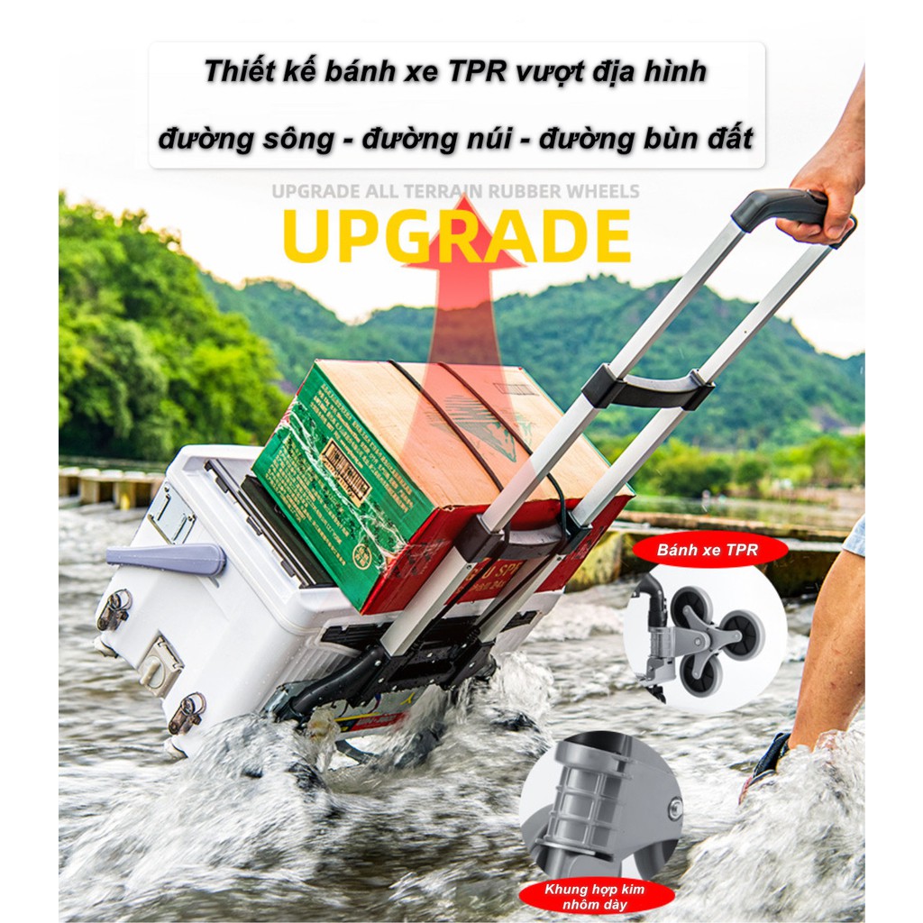 - Thiết kế bánh xe TPR , khung hợp kim nhôm dày có thể vượt mọi địa hình như đường sông , đường đất đá , leo bậc thang...