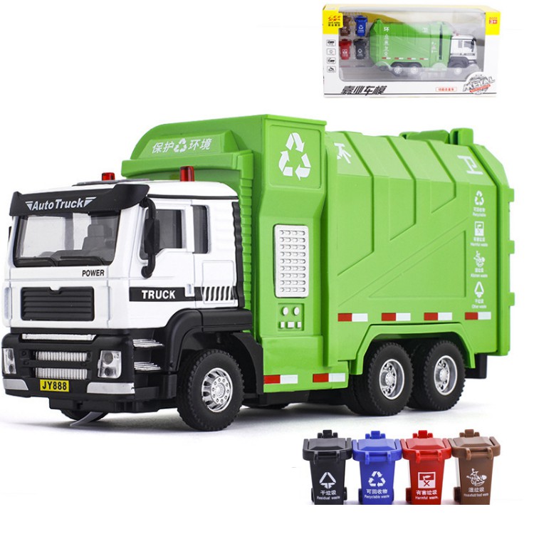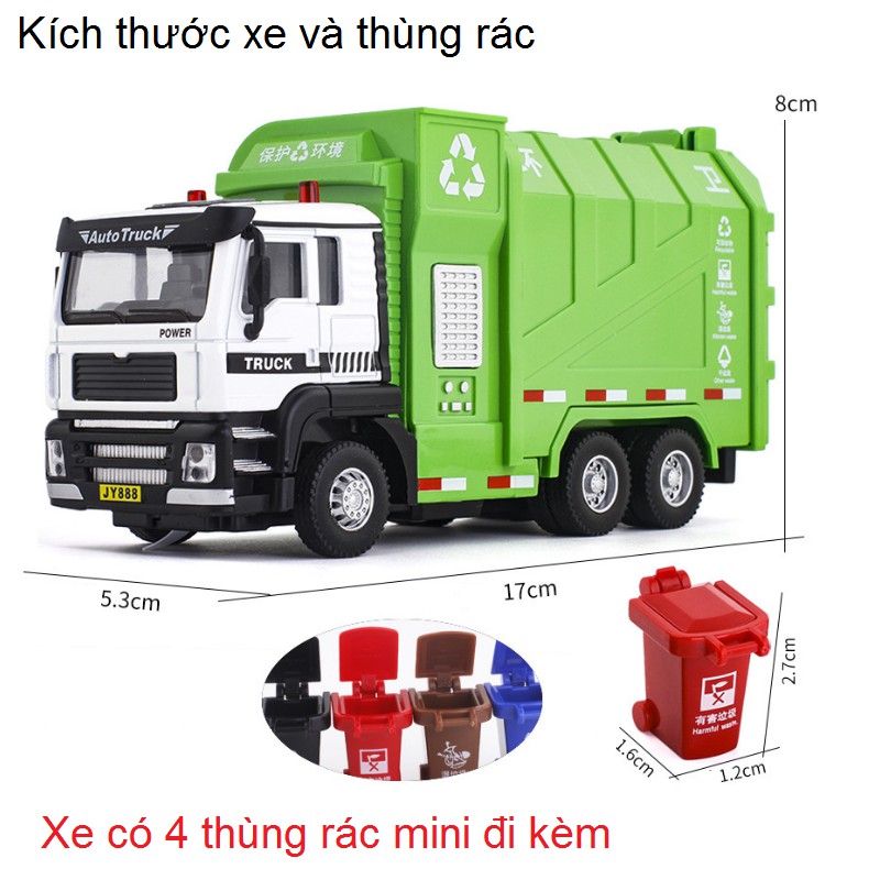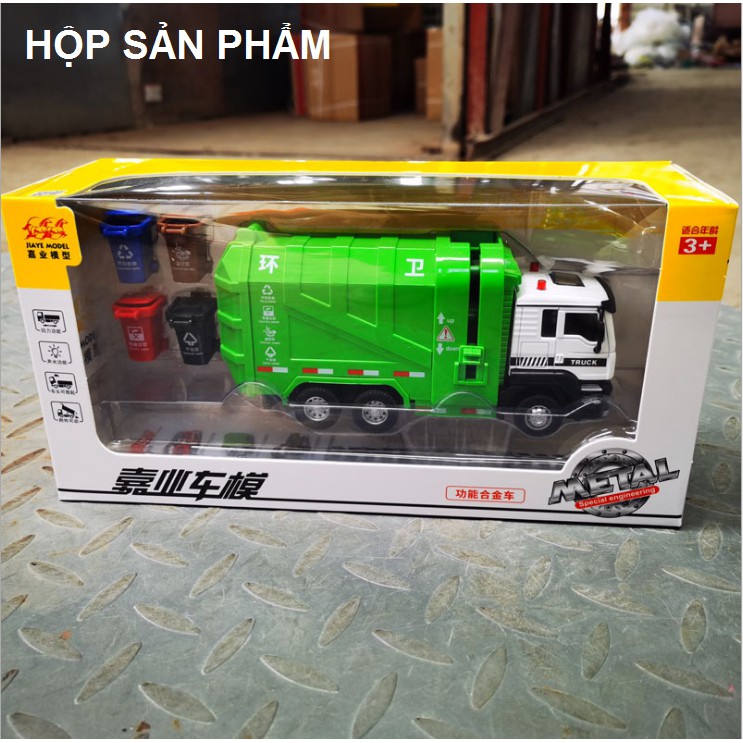 Xe mô hình ô tô chở rác bằng hợp kim và nhựa có âm thanh và đèn tỉ lệ 1:50 kèm 4 thùng rác mini