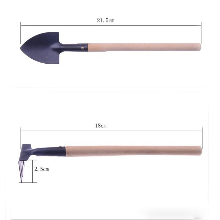 Bao gồm: 1 xẻng kích thước dài 21,5cm và 1 cuốc kích thước 18x2,5 cm
