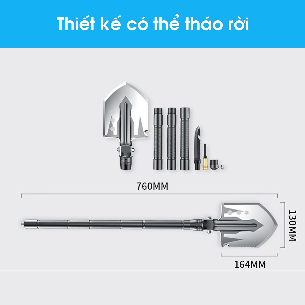Xẻng tháo rời ra 3 đốt rất tiện dụng, dễ dàng gấp gọn nhét vừa ba lô khi đi du lịch, dã ngoại, làm vườn