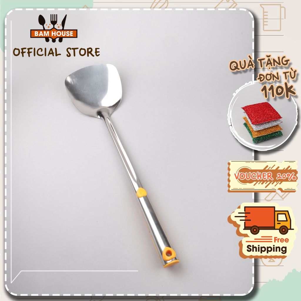 Nhà cửa & Đời sống > Dụng cụ nhà bếp > Cây vét bột & đồ gắp thức ăn || Xẻng lật chiên xào đồ ăn Bam House loại lớn cán bọc nhựa cam vàng inox cao cấp XCD01 – Fuki24Còn hàng
