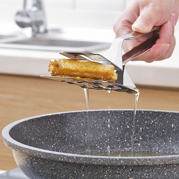 - Bề mặt xẻng to rộng giúp lật đảo dễ dàng mà không bị vỡ thức ăn, có các rãnh, lỗ thoát lớn dễ thoát dầu dầu, mỡ sau khi vớt thức ăn ra khỏi nồi, chảo chiên…giúp thức ăn mau ráo dầu.