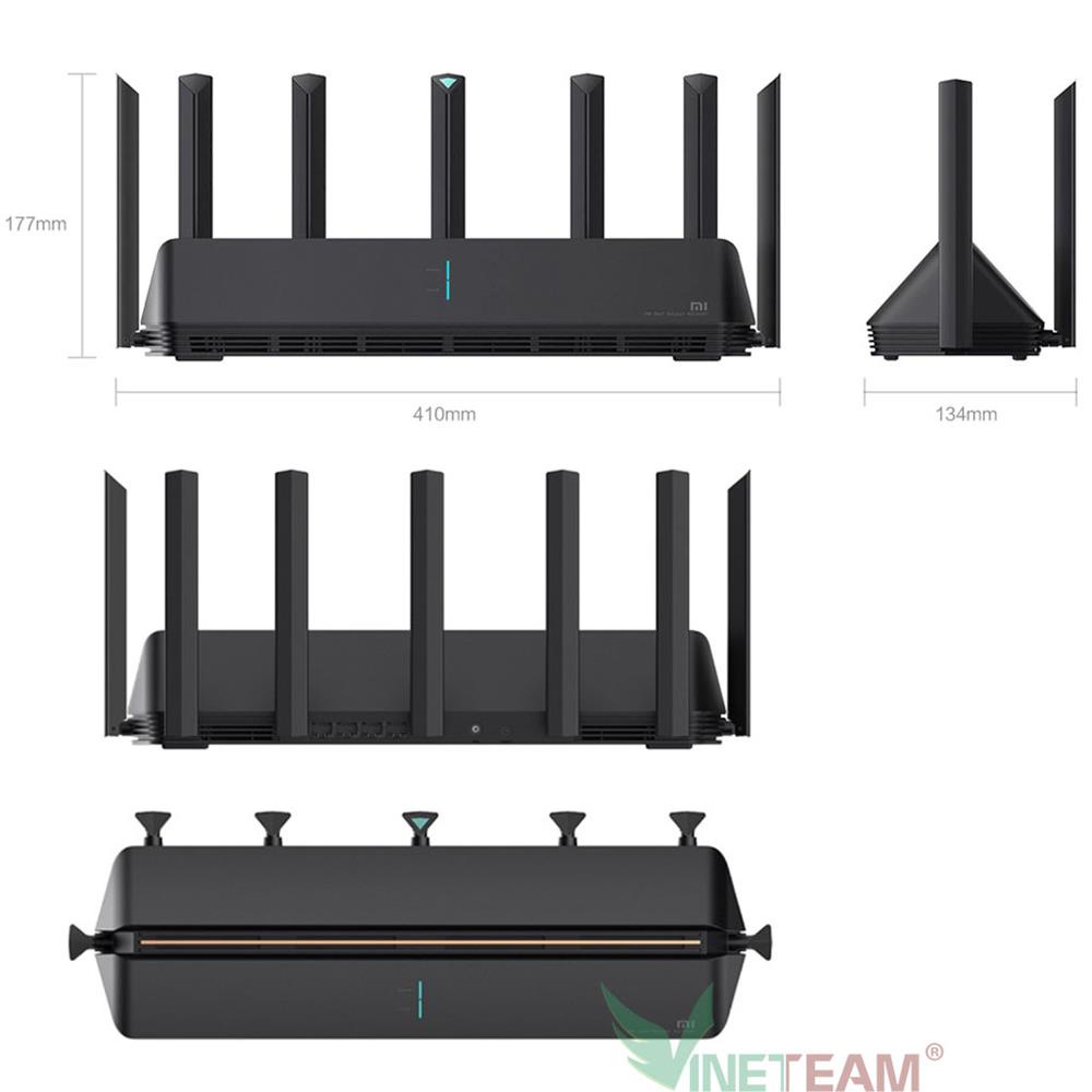 ROUTER WIFI XIAOMI AX3600 được thiết kế hiện đại, vẻ ngoài hầm hố với kích thước là 410x177x134 mm. Phần vỏ bên ngoài có màu đen được hoàn thiện từ chất liệu nhựa cao cấp tạo nên vẻ cứng cáp, đồng thời còn giúp Router bền bỉ hơn, chịu được va đập. Toàn bộ Router có tổng cộng 7 ăng-ten, giúp sản phẩm có khả năng truyền phát sóng tốt để đảm bảo chất lượng mạng được tốt nhất và cũng làm tăng thêm vẻ ngoài bắt mắt của sản phẩm.