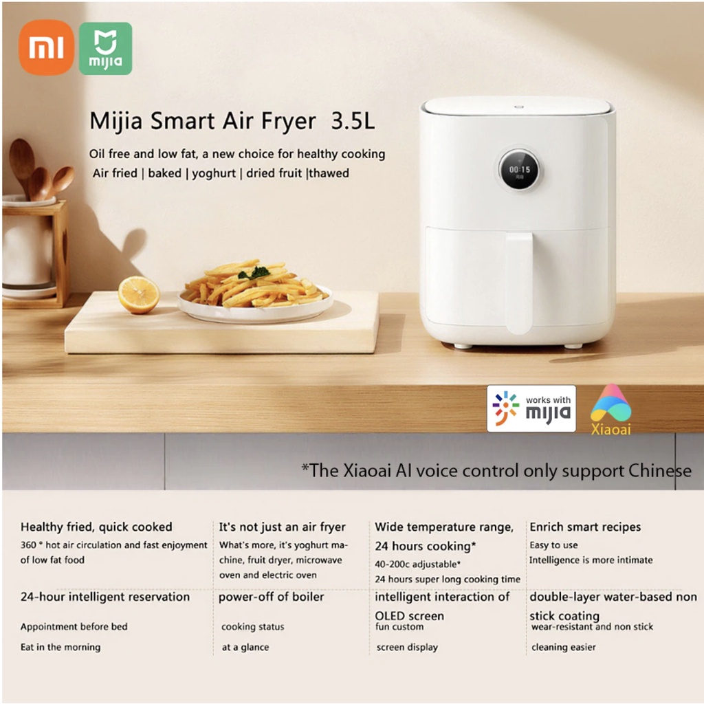 1. mô tả:Xiaomi Mijia Smart Air Fryer 3.5L 1500W Oven with Núm điều khiển / Màn hình hiển thị OLED tùy chỉnh / Nhắc nhở lắc / Hẹn nấu 24H / 50 + Công thức nấu ăn hoạt động với Mijia APP cho Air Frying / Rang / Giữ ấm 220V