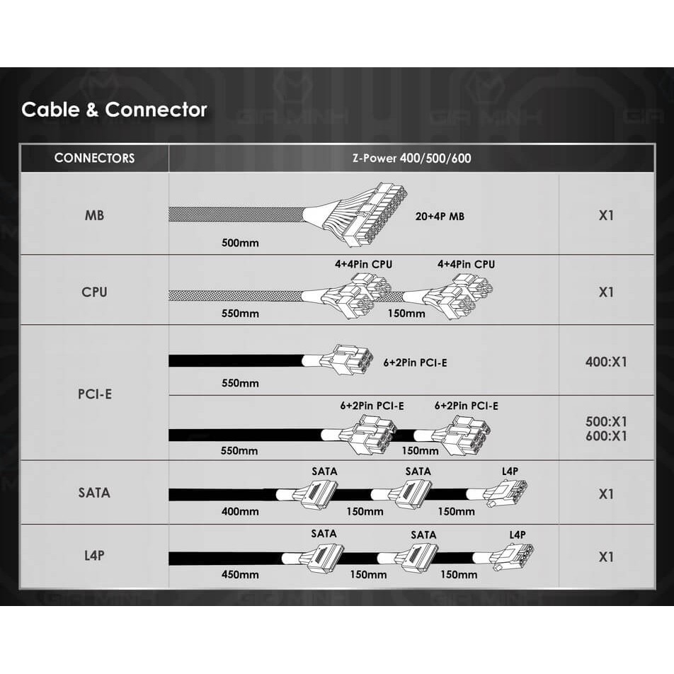 CỔNG KẾT NỐI: 20+4pin * 1 / CPU 4+4pin * 1 / PCI-E 6pin * 1 / SATA * 2 / Molex 4pin * 2