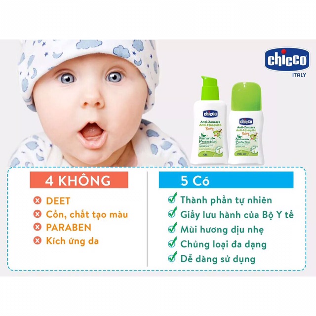 - Duy nhất sản phẩm Chống muỗi Chicco được Viện Vệ sinh Dịch tễ TW khảo nghiệm sử dụng an toàn và hiệu quả cho trẻ sơ sinh, được Bộ Y Tế Việt Nam và Cơ quan quản lý ở trên 100 quốc gia (Mỹ, Nhật, EU và các nước khác) cấp giấy phép lưu hành.