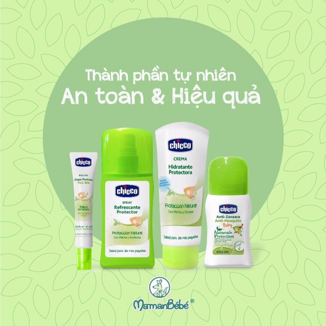 - Bình xịt chống muỗi Chicco có thành phần tự nhiên với hoạt chất Citrodiol chiết xuất từ cây Bạch đàn Úc đã tạo ra bí quyết chống muỗi của Chicco, có thể chống lại những loại muỗi nguy hiểm nhất như muỗi Hổ châu Á (1 loại muỗi Vằn/Aedes nguy hiểm, truyền virus Zika gây teo não, virus Sốt xuất huyết Dengue, Viêm não... ). Citrodiol là hoạt chất được công nhận rộng rãi trên thế giới về tính an toàn và hiệu quả trong việc chống muỗi và côn trùng.