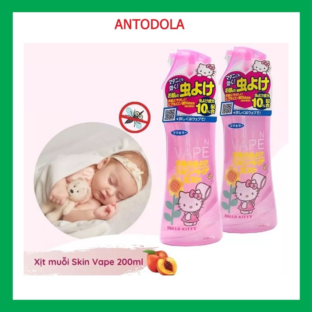 Xịt Chống Muỗi Skin Vape 200ml Xịt Đuổi Muỗi và Côn Trùng Cho Bé Nội Địa Nhật Bản Skin Vape Repellent Mosquito And Insect Spray 200mlXịt chống muỗi Skin Vape Nhật Bản 200ml chứa hoạt chất Deet với nồng độ không quá 10% có tác dụng xua đuổi các loại côn trùng, bọ chét, bọ ve, muỗi, rệp... Skin Vape có các thành phần giữ ẩm từ nguồn gốc thực vật, không chứa các chất tẩm màu, gây mùi, hay gây dị ứng cho da, thích hợp sử dụng cho bé từ 6 tháng tuổi trở lên.
