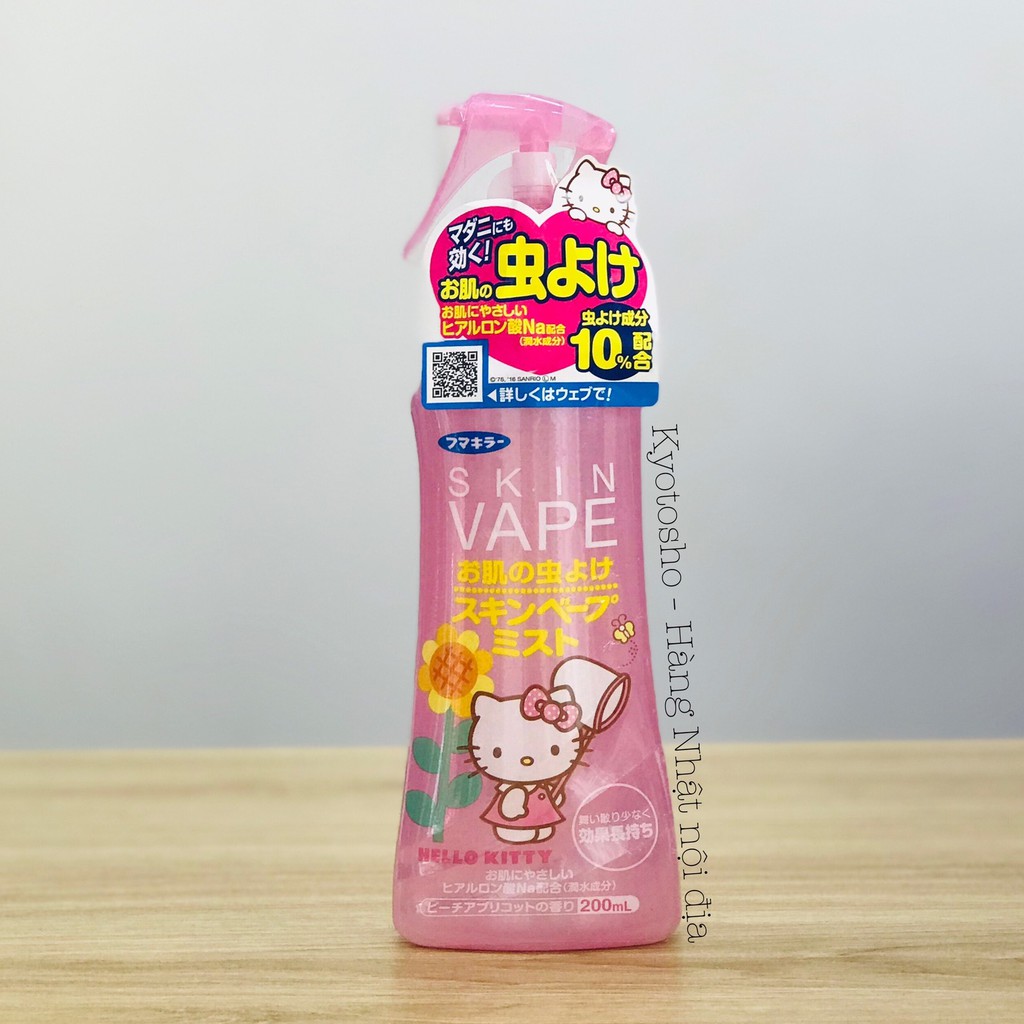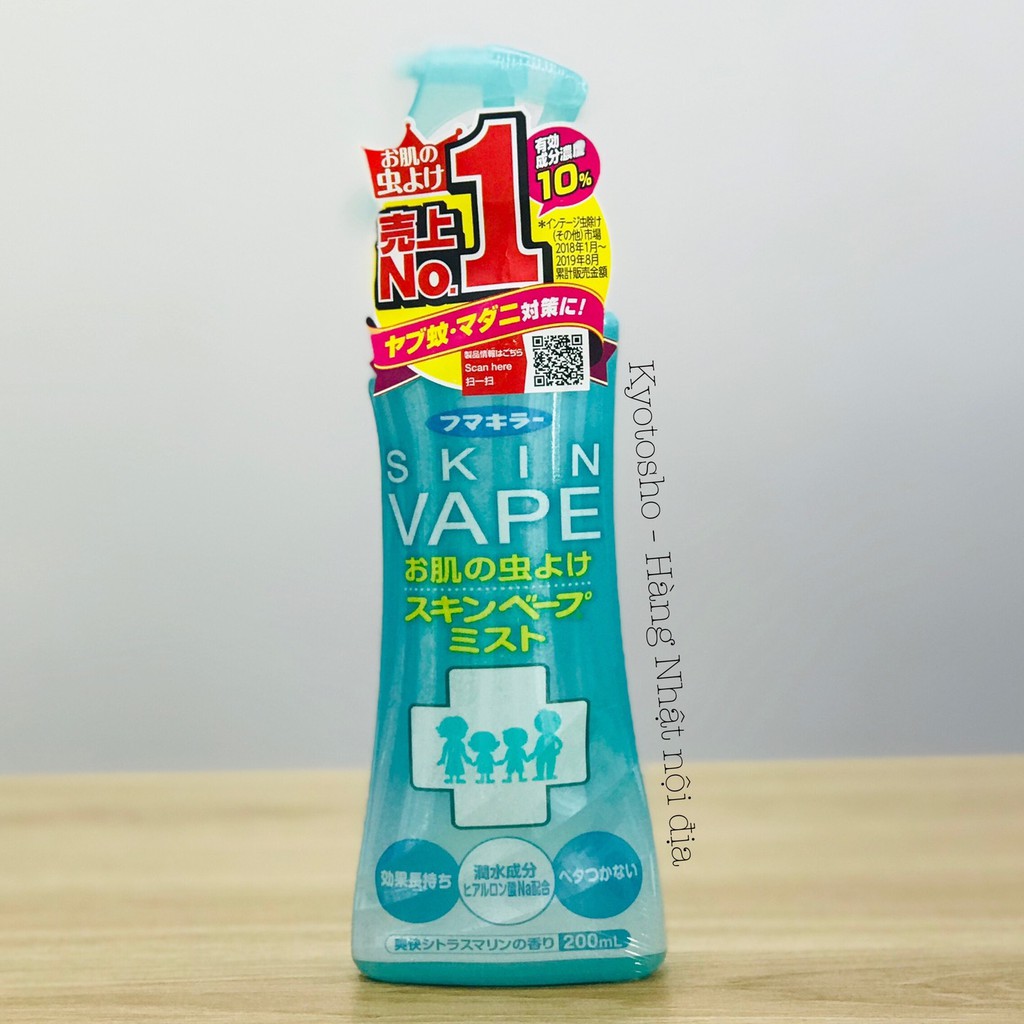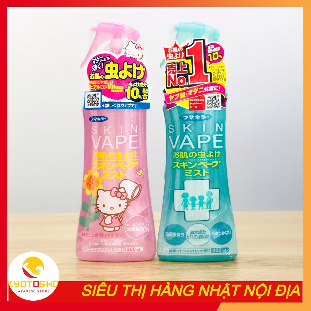 Xịt chống muỗi và côn trùng Skin Vape Nhật Bản 200ml là dòng sản phẩm đuổi muỗi bán chạy tại thị trường Nhật Bản, chứa hoạt chất Deet với nồng độ không quá 10% có tác dụng xua đuổi các loại côn trùng, bọ chét, bọ ve, muỗi, rệp... Skin Vape có các thành phần giữ ẩm từ nguồn gốc thực vật, không chứa các chất tẩm màu, gây mùi, hay gây dị ứng cho da, thích hợp sử dụng cho bé từ 6 tháng tuổi trở lên.Dung tích: 200ml