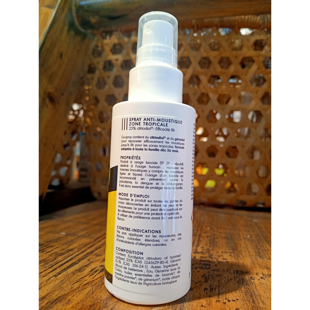 Thuốc xịt đuổi muỗi này có chứa citriodiol® và geraniol để đuổi muỗi hiệu quả đến 8h cho các khu vực nhiệt đới.Công thức từ thực vật với tinh dầu hữu cơ, phù hợp cho cả gia đình và trẻ em từ 36 tháng. Sản phẩm diệt khuẩn (TP 19: thuốc chống côn trùng), dành cho người sử dụng; xua đuổi côn trùng (muỗi và bọ ve).