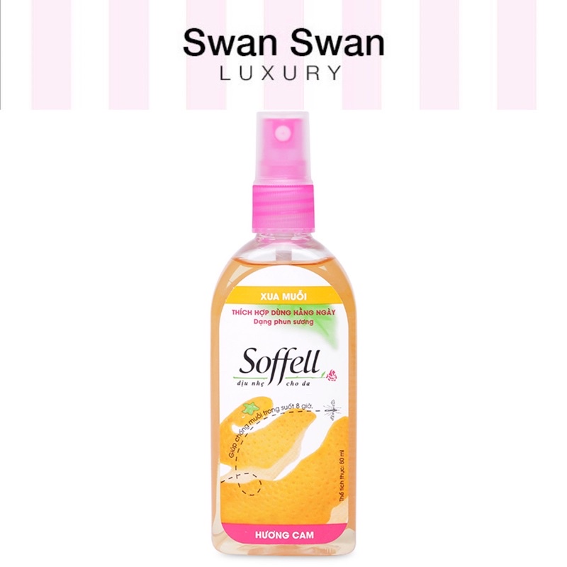 Sử dụng xịt chống muỗi hương cam Soffell làm cho muỗi tránh xa bạn trong suốt thời gian 8 giờ mà vẫn giữ cho làn da mềm mại. Soffell giúp bạn phòng ngừa các căn bệnh nguy hiểm do muỗi gây ra. Dạng xịt giúp tiết kiệm thời gian, tiện lợi cho người sử dụng.Cách sử dụng: