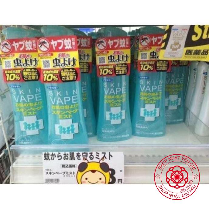 SHOPNHAT_YENCHIXịt chống muỗi và côn trùng Skin Vape Nhật Bản 200ml chứa hoạt chất Deet với nồng độ không quá 10% có tác dụng xua đuổi các loại côn trùng, bọ chét, bọ ve, muỗi, rệp... Skin Vape có các thành phần giữ ẩm từ nguồn gốc thực vật, không chứa các chất tẩm màu, gây mùi, hay gây dị ứng cho da, thích hợp sử dụng cho bé từ 6 tháng tuổi trở lên.