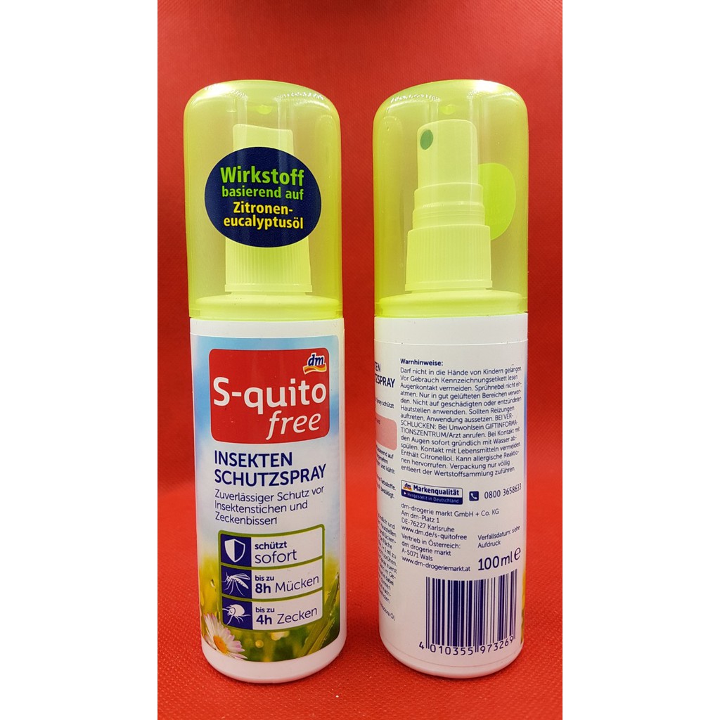 Sức Khỏe > Chăm sóc cá nhân > Chống muỗi & xua đuổi côn trùng || Xịt chống muỗi và côn trùng S-quito free Insekten schutzspray, 100 mlCòn hàng