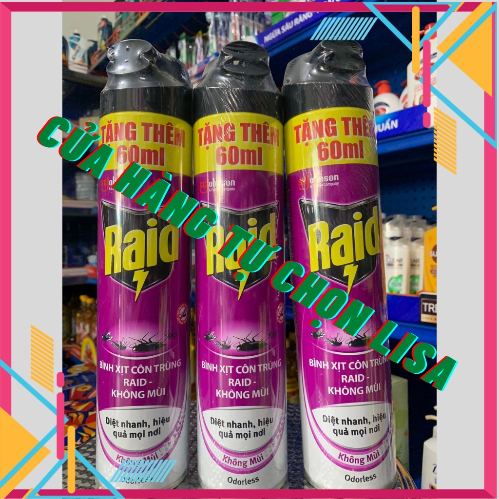 Xịt muỗi côn trùng Raid không mùi/ cam chanh/ lavender chai 600ml++Chai 600ml THÊM 60ML GIÁ KHÔNG ĐỔI