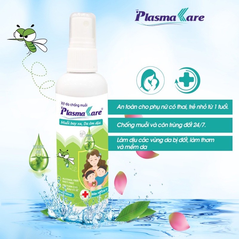 Xịt da chống muỗi PlasmaKare là sản phẩm đầu tiên tại Việt Nam kết hợp dầu Neem nguyên chất ép lạnh vốn là thiên địch của muỗi với Plasma Bạc kháng khuẩn, làm dịu vết đốt do côn trùng. Xịt da chống muỗi PlasmaKare giúp bảo vệ 24/7 bé yêu khỏi muỗi và côn trùng đốt: