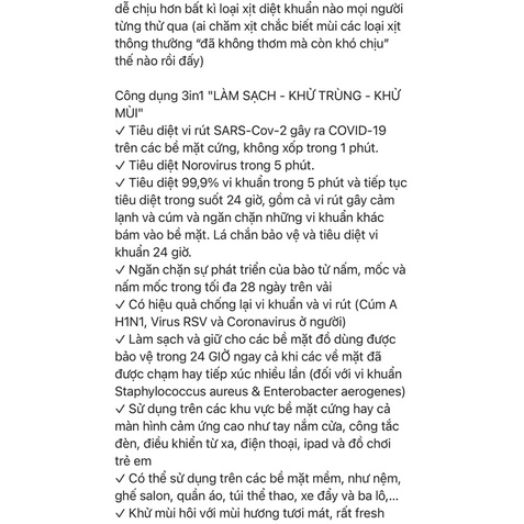 ✓ Đặc biệt là MÙI HƯƠNG tươi mát, rất tươi mát và dễ chịu hơn bất kì loại xịt diệt khuẩn nào mọi người từng thử qua (ai chăm xịt chắc biết mùi các loại xịt thông thường “đã không thơm mà còn khó chịu” thế nào rồi đấy)