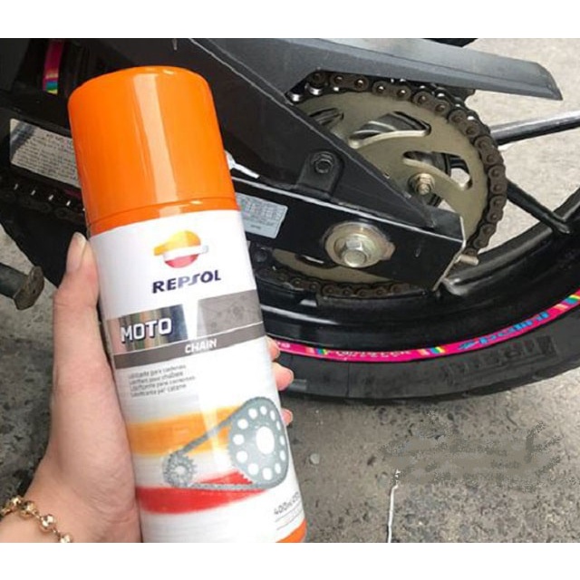 - Sau khi vệ sinh sên thì đợi sên khô, sau đó dùng chai Repsol Moto Chain 400ml xịt ướt đều sên với lượng vừa đủ, Đợi khoản 10 đến 20p để dung dịch thấm đều sên sau đó tiếp tục vận hành.