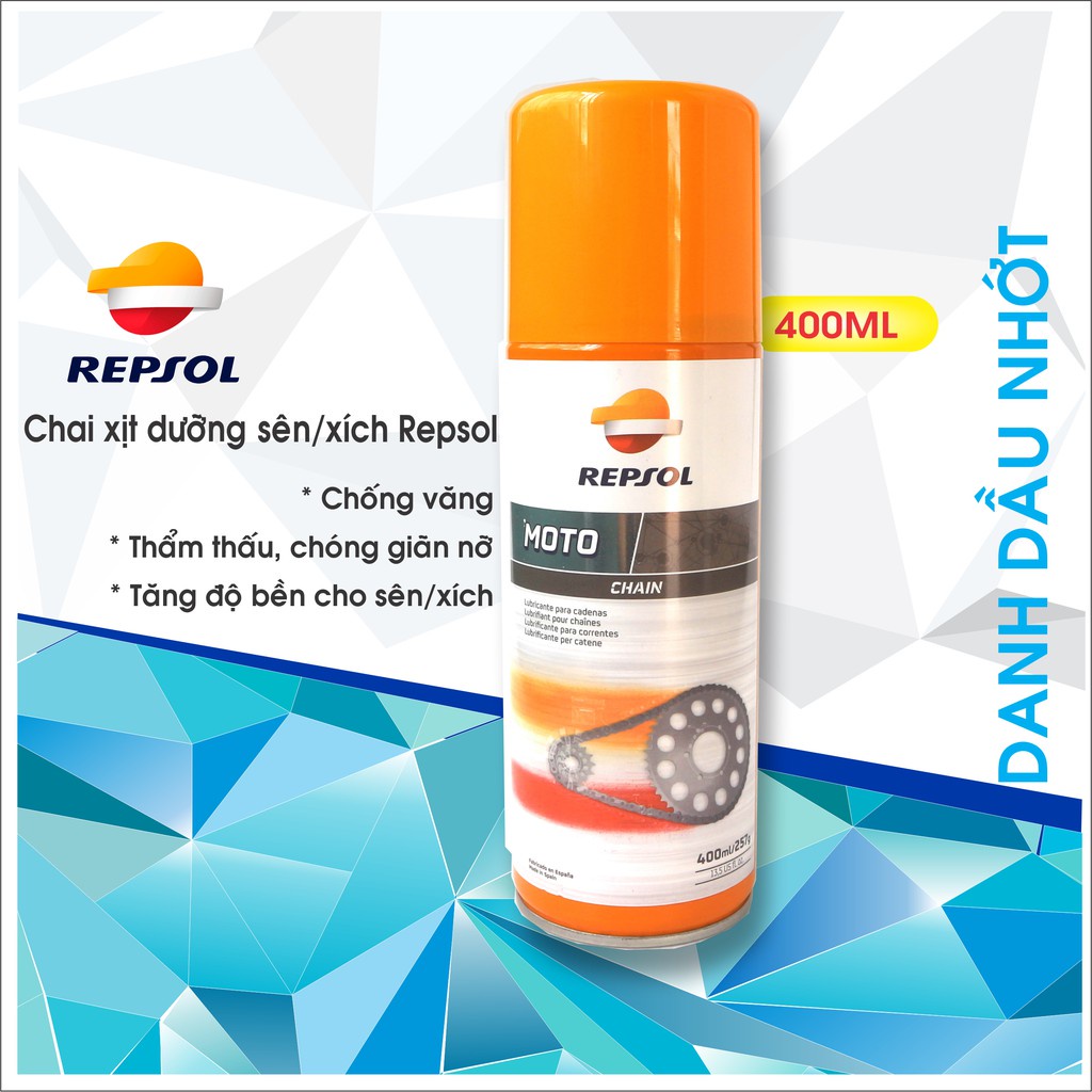 Ô tô > Dầu nhớt và phụ gia ô tô > Mỡ & Chất bôi trơn || Xịt Dưỡng Sên REPSOL Moto Chain Lube 400ML, Chai Vệ Sinh Sên, Dưỡng Xích Bôi Trơn Sên Xe Máy Chuyên NghiệpCòn hàng
