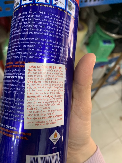 Dầu chống rỉ và bôi trơn X5 với công thức được cải tiến giúp thấm sâu và bôi trơn, giúp nới lỏng dễ dàng các bộ phận bị kẹt, bị rỉ sét.– Thành phẩn hỗn hợp gồm dầu cao cấp dễ thấm, nhờn với công thức được cải tiến với hóa chất đậm đặc chống rỉ sét, dễ dàng xuyên thấm vào các bộ phận bị kẹt, phá vở cấu trúc rỉ sét, giúp khôi phục truyền động thông suốt, bảo vệ kim loại khỏi bị rỉ sét và bôi trơn, đảm bảo cho máy móc hoạt động hiệu quả, giúp gia tăng tuổi thọ của dụng cụ và thiết bị.