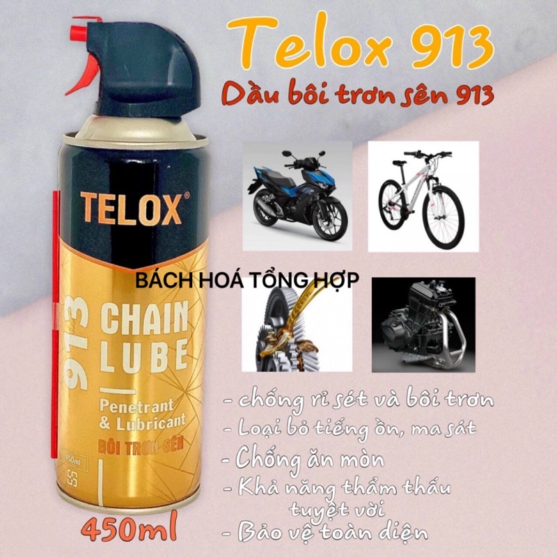Giới thiệu sản phẩm vệ sinh sên TELOX 913Sản phẩm bôi trơn sên xe máy với thành phần dầu gốc cao cấp và các chất phụ gia đặc biệt nhập khẩu từ Nhật giúp sên hoạt động êm ái, tránh những tiếng kêu xè xè đối với các loại sên trần qua đó gia tăng độ bền của sên, hạn chế vấn đề co giãn sên khi vận hành.