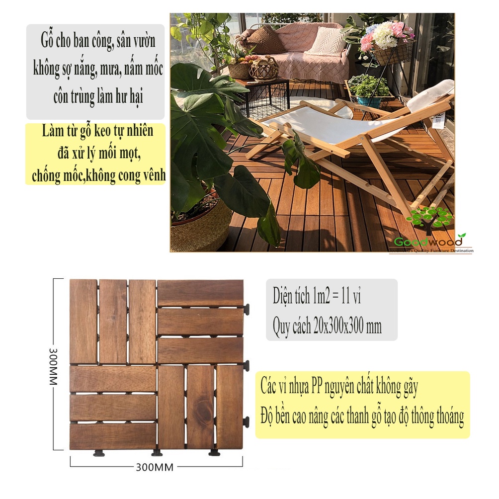 Home decor cam kết bán hàng chính hãng Bạn có thể lát gỗ cho ban công, sân vườn mà không sợ nắng, mưa, nấm mốc, côn trùng làm hư hại.. vì được sơn phủ 4 lớp.Thỏa sức sáng tạo trang trí phòng tắm, phòng khách, phòng ngủ... cho những sự kiện đặc biệt vì lắp đặt và tháo ráp dễ dàng nhanh chóng.