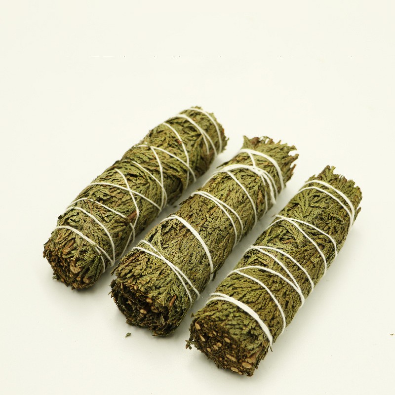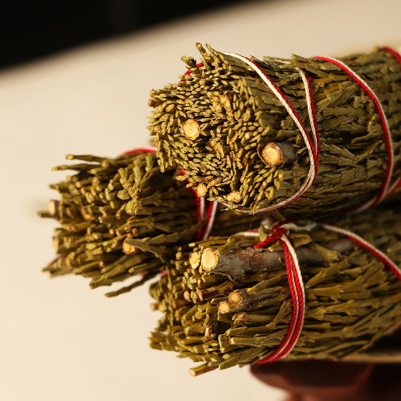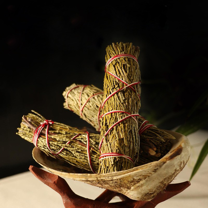 - Cành tuyết tùng còn nguyên lá được bó lại dài tầm 10 - 15 cm, đường kính tầm 3 cm. Phơi thật khô để có tác dụng tạo khói tốt hơn khi đốt.