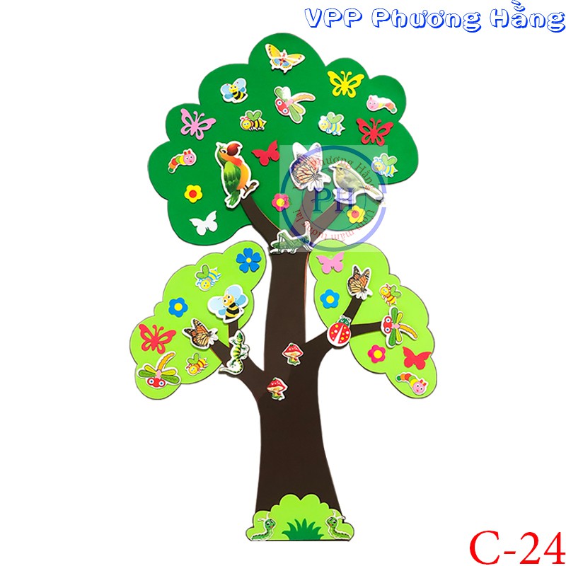Trên cây được dán nhiều loại sinh vật bằng giấy in cán bong hoặc xốp dày ~ 2mm