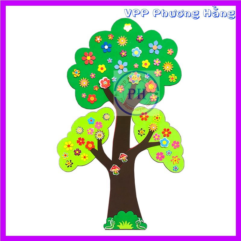 Trên cây được dán hình nhiều loại hoa bằng giấy in cán bóng hoặc xốp dày ~ 2 mm