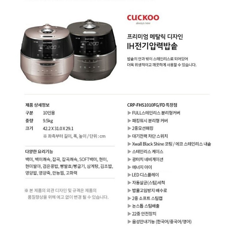 Model Cuckoo CRP-FHS1010FG thuộc dòng sản phẩm nồi áp suất cao tần( IH) là dòng nấu cơm ngon nhất hiện nay.