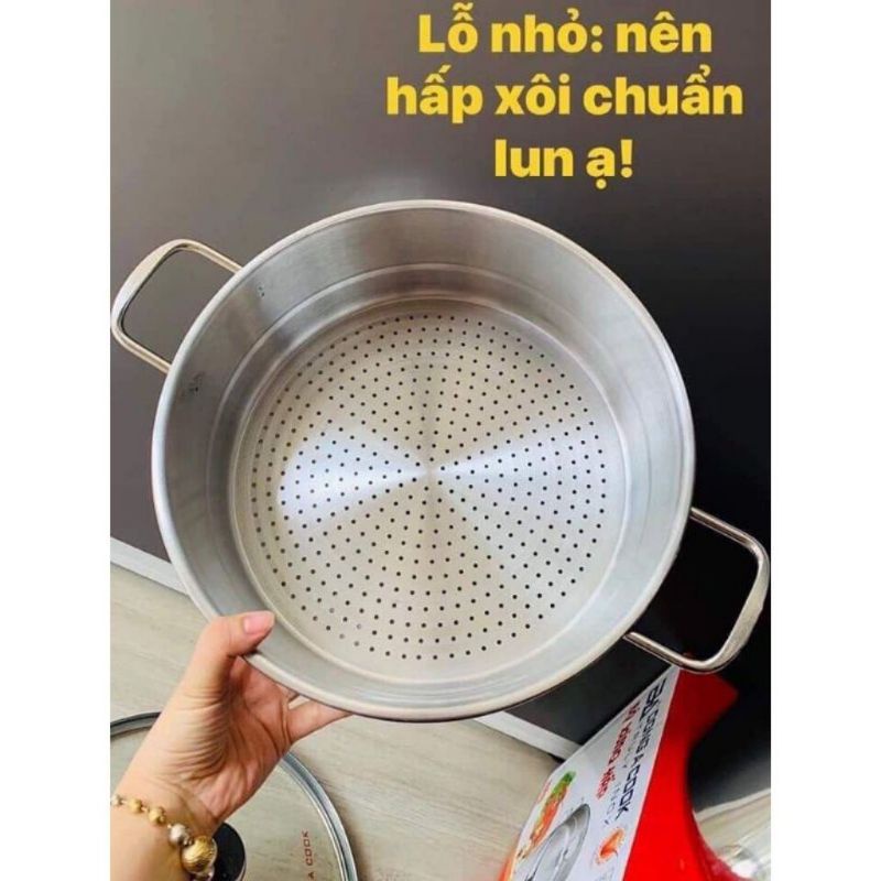- Thiết kế bên trong xửng hấp có nhiều lỗ thông hơi hơn, tạo khoảng trống để hơi nước thoát lên được nhiều hơn, hơi nóng tuần hoàn đều trong nồi khiến thức ăn chín nhanh hơn