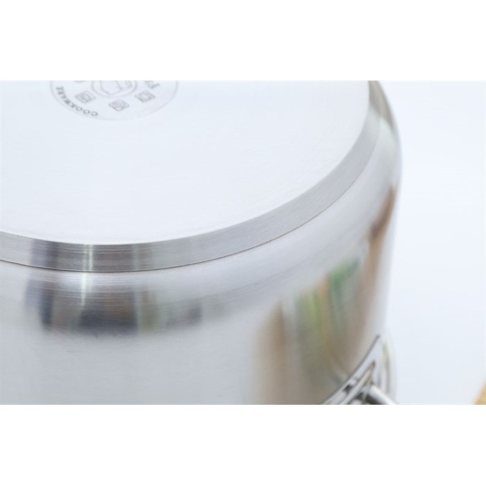 Đáy nồi thiết kế rộng, phẳng, dập 3 lớp (inox 430 – nhôm – inox 430). Đặc tính của inox là ít phản ứng với thức ăn, an toàn sức khỏe, đặc tính của nhôm là hấp thu nhiệt tốt, tỏa nhiệt đều, nấu thức ăn chín nhanh, tiết kiệm năng lượng tối ưu.
