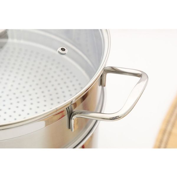 Thiết kế sang trọng, đẹp mắt tiện dụng với 1 nồi và 1 xửng hấp. Xửng hấp với thành cao giúp chứa được lượng lớn thức ăn, hơi nóng tỏa đều và nhiều hơn giúp thức ăn chín nhanh và ngon hơn. Tùy theo nhu cầu có thể dùng nồi để hấp hoặc nấu thực phẩm. Nấu canh, nấu lẩu cho gia đình 4 – 6 người; xửng hấp đi kèm giúp chế biến các món bánh, xôi, món hấp thơm ngon.